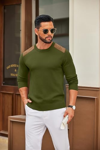Fabric type: 100% PolyesterCare instructions: Hand Wash OnlyOrigin: ImportedNeck style: Crew NeckPremium Knit Fabric --- Crafted from soft, skin-friendly polyester fabric, this men's round-neck sweater offers comfort, elasticity, and balanced warmth with breathability for all-day wear.Classic and Fashion Design --- Featuring a timeless round neck, long sleeves with ribbed cuffs/hem, and textured knit patterns, it elevates tradition with modern details like contrast leather shoulder panels for refined sophistication.Knitted Sweaters --- Layer over a thermal men crewneck sweater with casual trousers for relaxed autumn style; pair with coats or jackets to create polished winter ensembles. Maintains modern warmth across versatile looks.Knit Pullover Sweater --- Casual, golf, streets, vacations, dates, offices, business, meetings, dinners, parties. The tailored fit adapts seamlessly from daily routines to formal events.Size Note --- US Sizing. Consult our size chart before purchasing our dress roundneck pullover sweaters to ensure the perfect fit. Perfect for everyday use. premium materials and excellent craftsmanship ensure long-lasting durability.