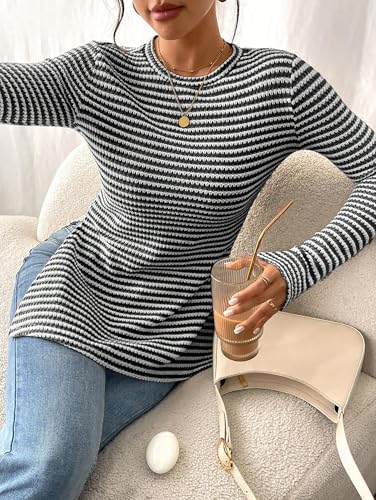 Fabric type: 65% Viscose, 35% PolyesterCare instructions: Hash Wash, Machine WashOrigin: ImportedClosure type: Pull OnLightweight Comfy Fabric: Women's fall top 2025 is made of lightweight, breathable fabric that offers a soft touch. It fits well for seasonal transitions, providing comfort without a bulky feel. Suitable for all-day wear, it works for daily activities, from errands to gatherings. The fabric¡¯s texture adds to the wearing experience, making it a practical basic for fall wardrobesSlim Fit and Fitted Silhouette: With a slim and tight-fitted design, this long sleeve crew neck top presents a sleek look. It comes in sizes M, L, XL, XXL, fitting closely without being restrictive. The round crewneck adds a classic element, and the tailored shape is suitable for both dressy casual occasions and everyday use.Trendy Striped with Side Slit Design: Featuring cute striped pattern and side slit, the long sleeve top follows 2025 fall fashion trends. The color block stripes add visual appeal, different from ordinary tees. The side slits allow for easy movement, combining practicality with style, which is suitable for various daily or outgoing scenesVersatile for Multiple Scenes: This striped tunic top can be paired with leggings, jeans, or skirts for a neat look. It works as a dressy casual choice for brunch, a top for outings, or a cozy option for home. It is suitable for fall outings, office days, or weekends, and can transition from day to night with simple accessory changes2025 Fall Fashion & Easy Care: The long sleeve crew neck shirt combines classic stripes with latest elements. It can be machine washed cold with similar colors and tumble dried on low, which helps keep the fabric soft, stripes bright, and shape intact. It is a timeless and trendy addition to autumn 2025 wardrobes Perfect for everyday use. premium materials and excellent craftsmanship ensure long-lasting durability.