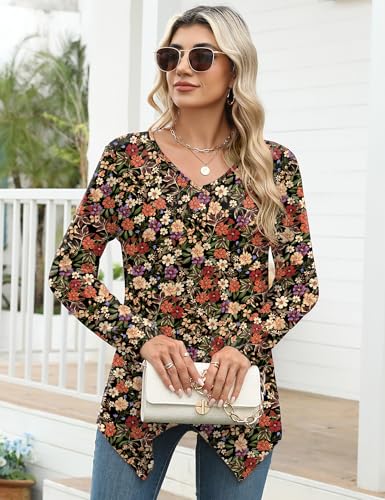 Rapbin Long Sleeve Womens Tops V Neck Casual Tunic Tops Basic Pleated Flowy Asymmetrical Hem Shirts Loose Fit 2025 M-3XL