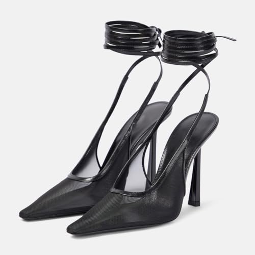 Women's Slingback Sandals Ankle Strap Mesh Pumps Lace Up High Heels Sexy Pointy Closed Toe Stilettos for Party Prom Dress Shoes