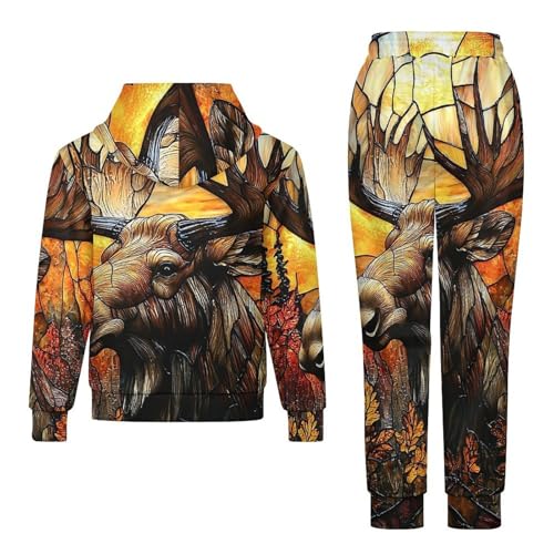 Boys Girls Sweatshirt Set 2 Piece Pullover Hoodie Kid Jogger Sweatpants, Moose Stained Glass Art