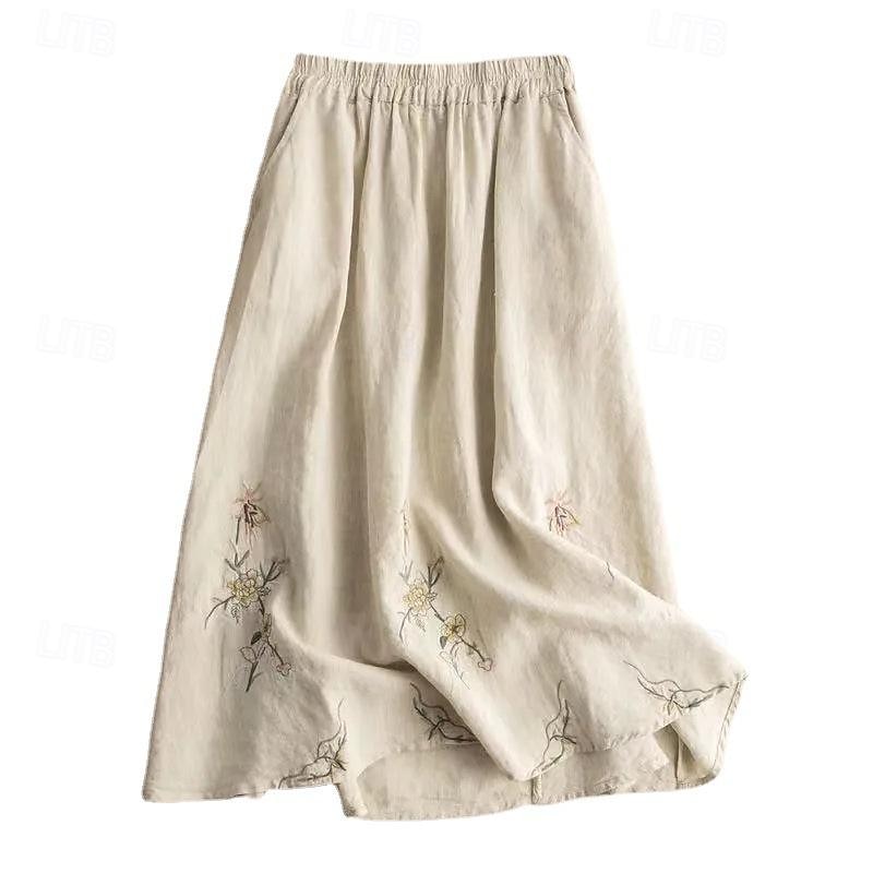 Women's Skirt Linen Skirts Fashion Casual Maxi High Waist Skirts Floral Embroidered Casual Daily Weekend Khaki Summer Cotton And Linen