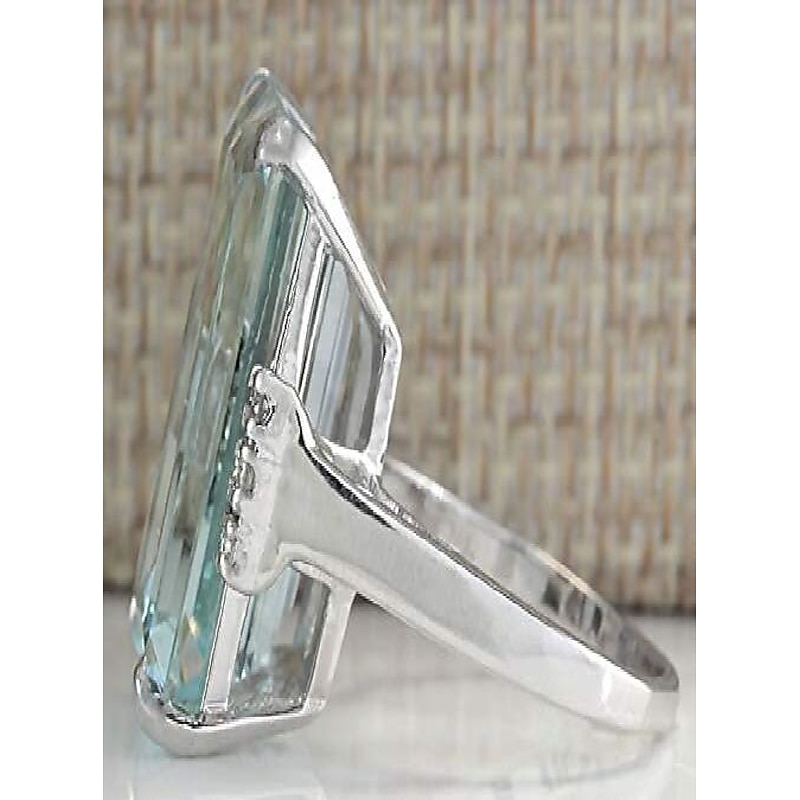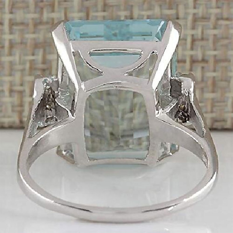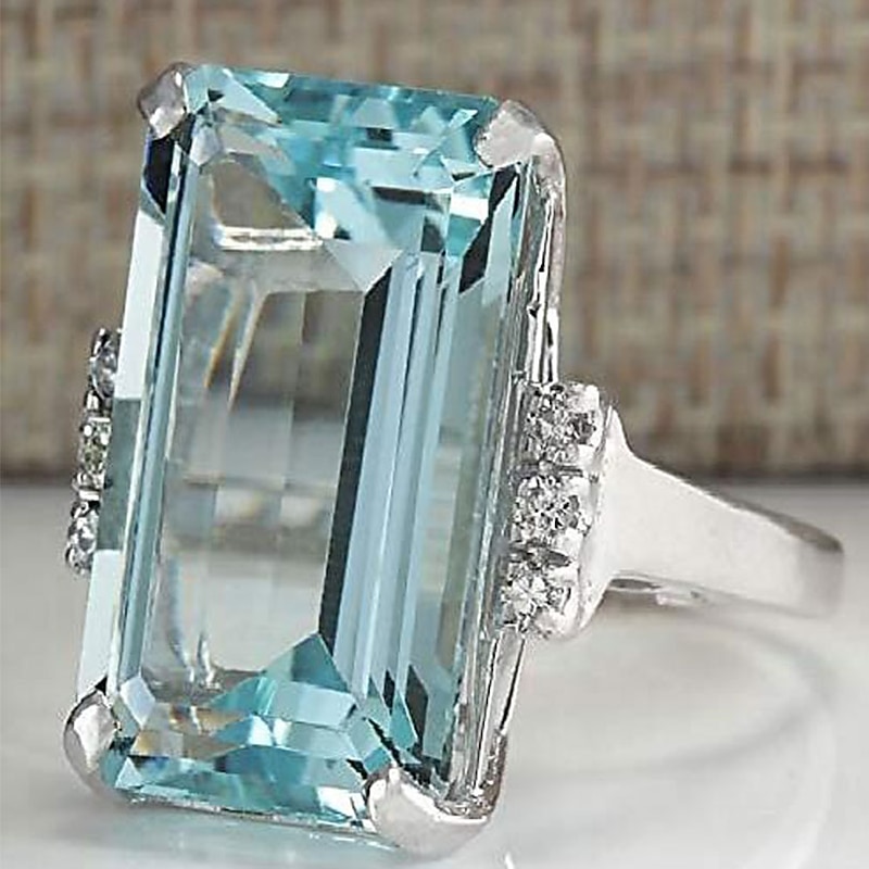 Highlights [Fabric and Material] This exquisite band ring is crafted from a durable alloy, providing a robust structure that supports the large, rectangular aquamarine gemstone. The high-quality metal, possibly sterling silver or white gold as per the description, contributes to its sleek and elegant finish, perfect for both everyday wear and special occasions. [Fit and Style] Designed with a classic yet contemporary style, this band ring features a chic and present-day aesthetic that enhances its versatile appeal. The band encases the gemstones securely, showcasing a harmonious blend of fashion and light luxury. [Design Highlights] At the heart of the ring is an eye-catching rectangular aquamarine gemstone, expertly cut to reflect light beautifully. This is complemented by small clusters of round, clear cubic zirconia or diamonds on either side, adding extra sparkle and enhancing the cool blue hues of the aquamarine, making it a standout piece. [Occasions] Ideal for a range of events, this ring is perfect for evening parties, weddings, and daily wear. Its sophisticated design makes it suitable for both formal occasions and more casual settings, offering versatility and style to any attire. [Size Range] Available in a variety of sizes including 6, 7, 8, 9, and 10, this ring caters to a wide range of preferences, ensuring a comfortable fit for many.