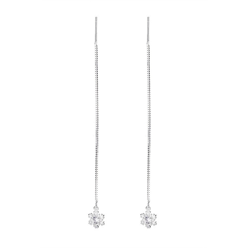 Highlights [Material] : Crafted from high-quality copper with a polished silver finish, these earrings offer both durability and elegance. The metal showcases a reflective surface that highlights the intricate snowflake design. [Style] : These women's earrings feature a contemporary design with a fine, elongated chain that allows for graceful movement. Their minimalist and sophisticated aesthetic makes them a versatile addition to any jewelry collection. [Design Highlights] : Highlighting a delicate snowflake motif at the end of each chain, these earrings are encrusted with shimmering gems for added sparkle. The lightweight, long chain adds a touch of elegance and modernity, making them suitable for both formal and casual settings. [Occasions] : Perfect for a variety of occasions including Christmas parties, outdoor events, weekend gatherings, and daily streetwear. Whether dressing up for a festive event or adding flair to your everyday look, these earrings provide a charming and trendy touch. [Size & Fit] : Designed as a one-size-fits-all accessory, these earrings are suitable for adult women of all ages. Their lightweight nature ensures comfort for extended wear.