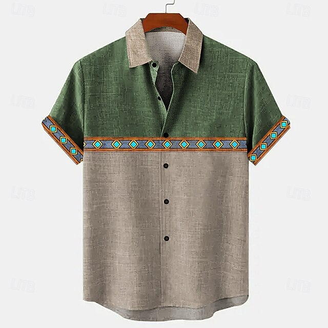 More information about Men's Geometric Linen Shirt Summer Hawaiian Shirt Button Up Shirt Short Sleeve Vintage Artistic Vacation Holiday Beach Wear Summer Spring Turndown Color Block Blue Green