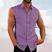 More information about Men's Shirt Summer Shirt Casual Shirt Beach Shirt Button Up Shirt Black Blue Purple Green Sleeveless Plain Lapel Vacation Hawaiian Pocket Clothing Apparel Cotton Polyester Fashion Casual plush