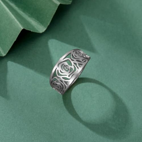 TEAMER Rose Flower Ring Stainless Steel Geometric Hollow Rose Flower Ring True fancy Wedding Band Jewelry for Women
