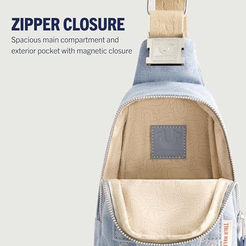 Fabric type: CottonOrigin: ImportedClosure type: ZipperLining: CottonTRUE RELIGION SLING BAG: Cute and sleek ladies denim over the shoulder bag features a distinctive denim design with our iconic horseshoe logo stitched onto the front pocket, sleek silver hardware, and an adjustable crossbody shoulder strap, making the side bag perfect for work, hiking, beach trips, traveling, or other outdoor activitiesEASY PORTABILITY: Crossover bag features a convenient adjustable shoulder strap for ease of travel to keep your personal items conveniently accessible while on the goABUNDANT STORAGE: Small cross body purse features a spacious main zipper compartment and an exterior front pocket with a magnetic snap closure for storing your keys, wallet, cell phone, camera, book, makeup supplies, and other personal belongings and essentials, and the zip closure of the chest bag keeps your items secure insideDURABLE: Messenger bag is composed of a lightweight and durable blend of cotton and polyester material for long-lasting reliability, and is easy to spot cleanPREMIUM QUALITY: Sling backpacks are officially licensed True Religion accessories, ensuring that you are receiving quality sling purses; crossbody bags measure 9.5 H x 6.5 W x 3 D in inches Perfect for everyday use. superior materials and excellent craftsmanship ensure long-lasting durability.