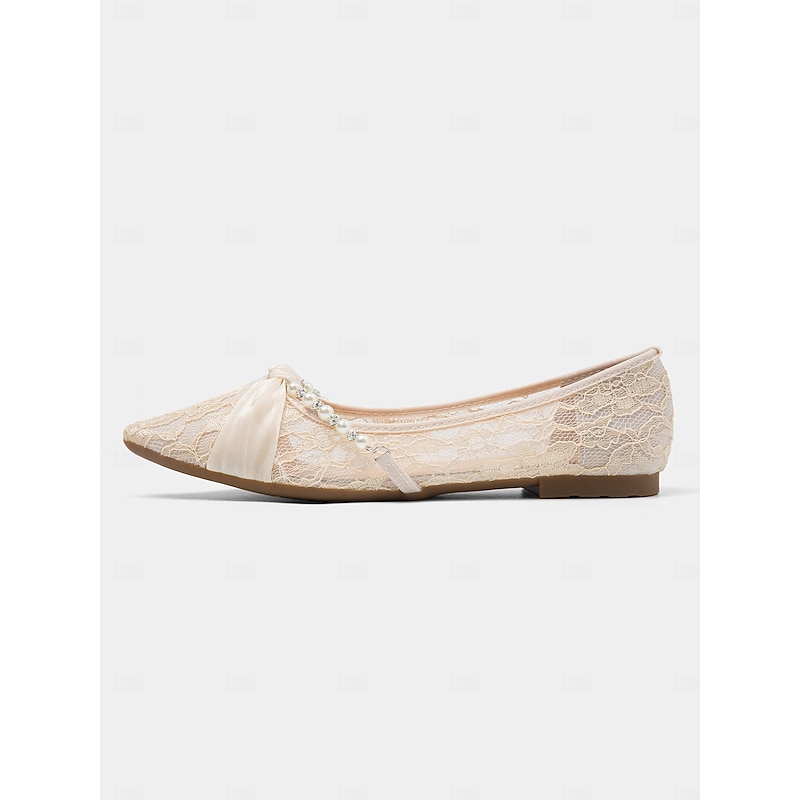 Women's Lace Pointed-Toe Flats with Pearl Embellishments and Bow Detail - Elegant Bridal Shoes for Weddings and Formal Occasions