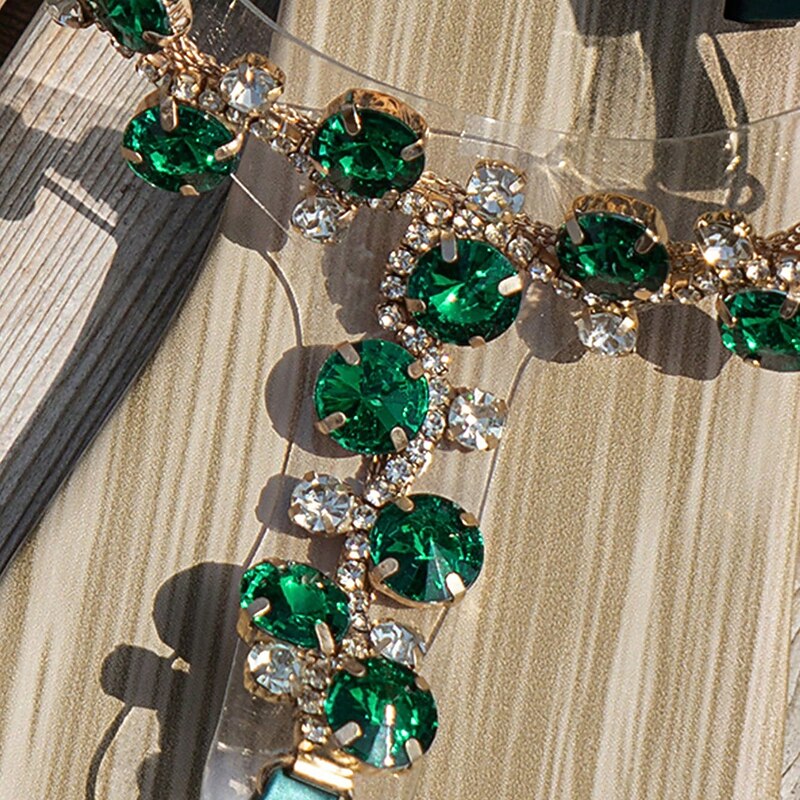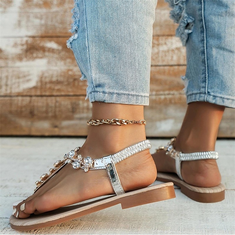 Women's Crystal-Embellished T-Strap Sandals – Elegant Rhinestone Flat Sandals for Weddings, Beach, or Special Occasions