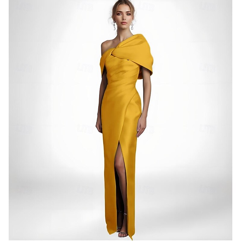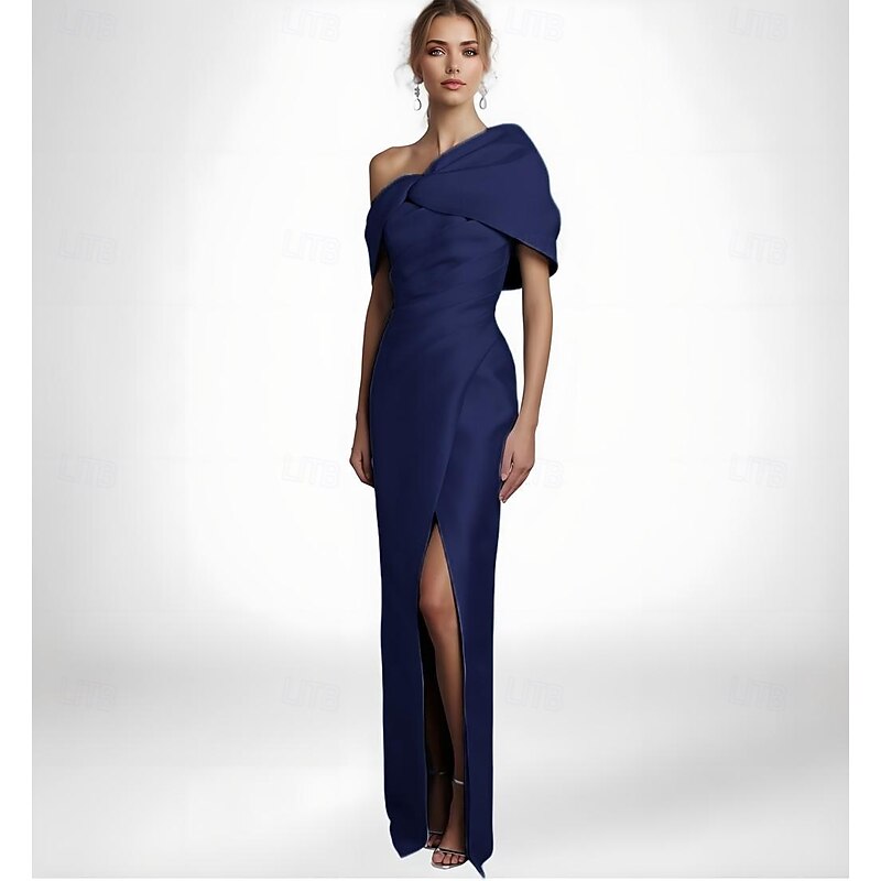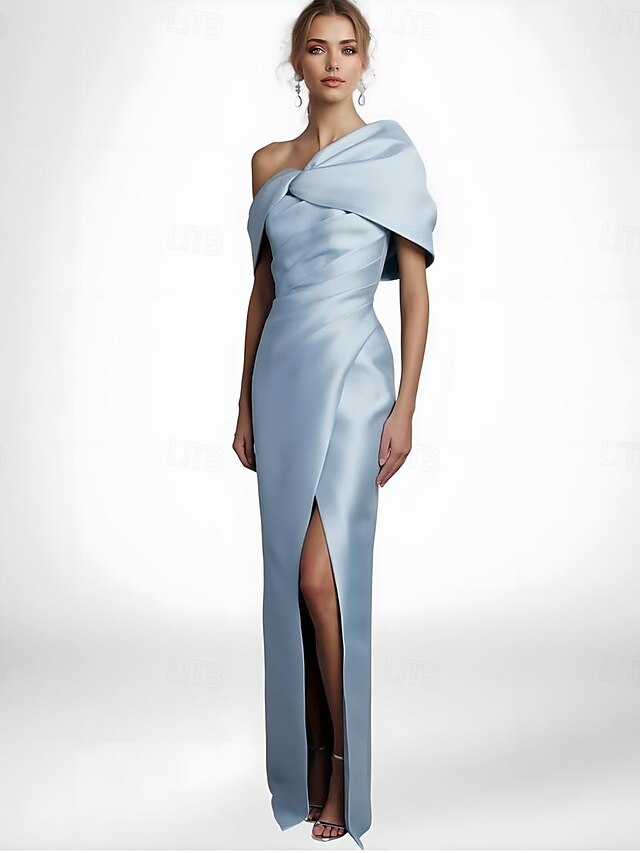 Why Choose Black Tie Cape Dress Sheath / Column Evening Gown Elegant Dress Formal Wedding Floor Length Sleeveless Off Shoulder Stretch Satin with Pleats Slit?