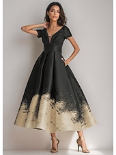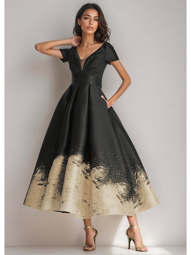 $159.99 - Black Gold A-Line Cocktail Gown Elegant Dress Formal Wedding Ankle Length Short Sleeve V Neck Pocket Satin with Floral Print 2025. Shop for cheap Cocktail Dresses online? Buy at lightinthebox.com on sale today!