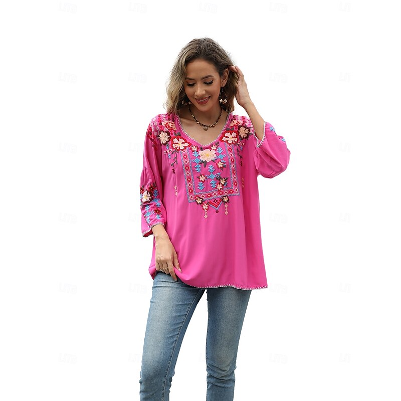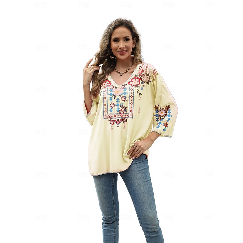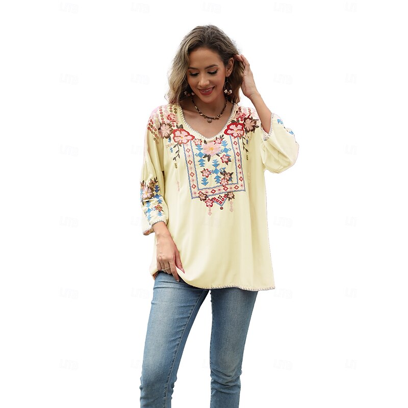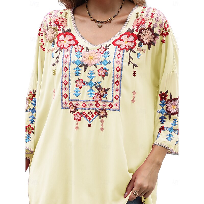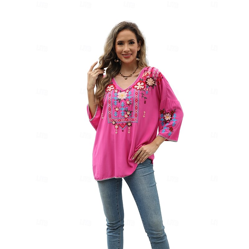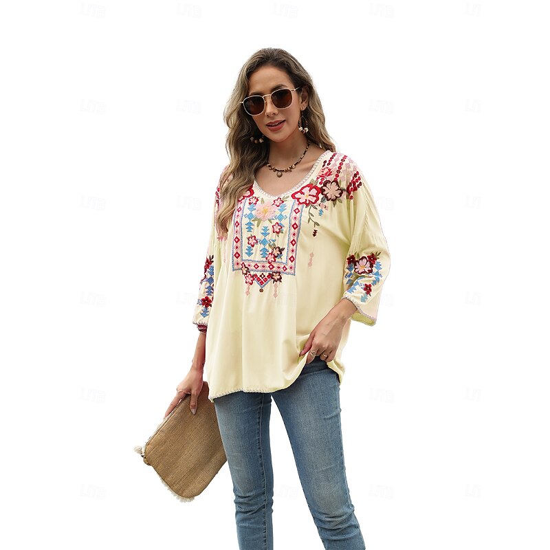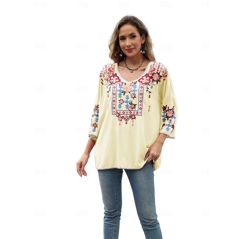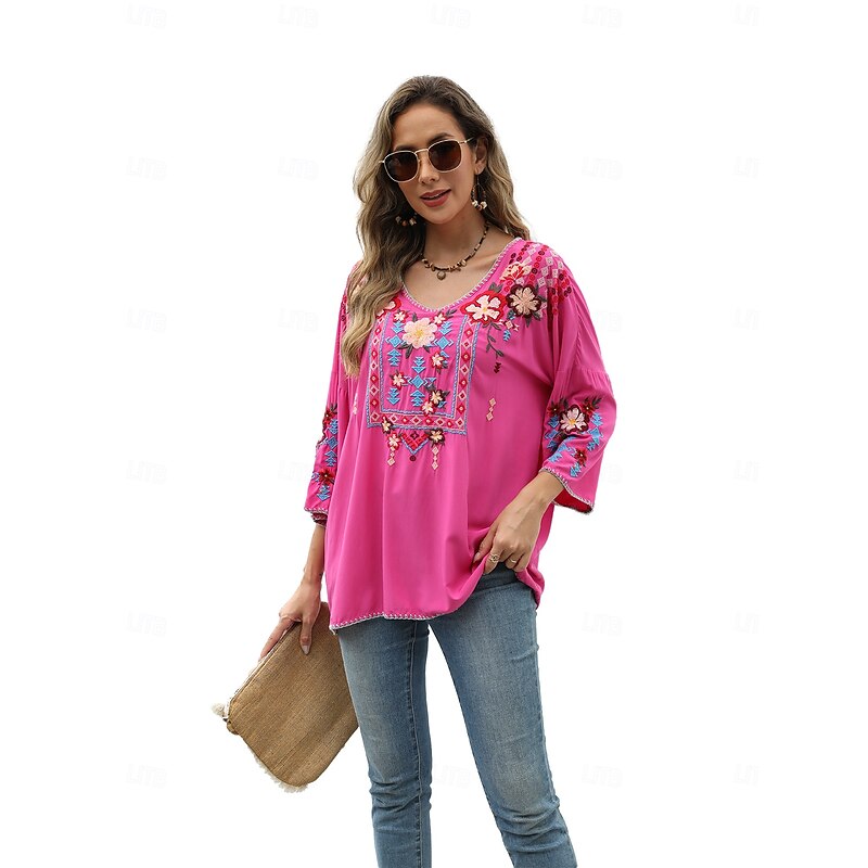 This Women's Boho Shirt Solid Color Floral Bohemia Daily Luxurious 3/4 Length Sleeve Elbow Sleeve Crew Neck Regular Tops Work Daily Going out Embroidered Black Yellow Rose Pink Summer combines elegant design with practical functionality. Every detail has been carefully considered to ensure you get the foremost possible experience. The supreme construction means this product will serve you well for years to come.