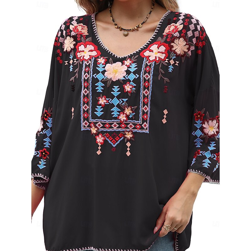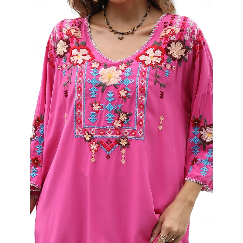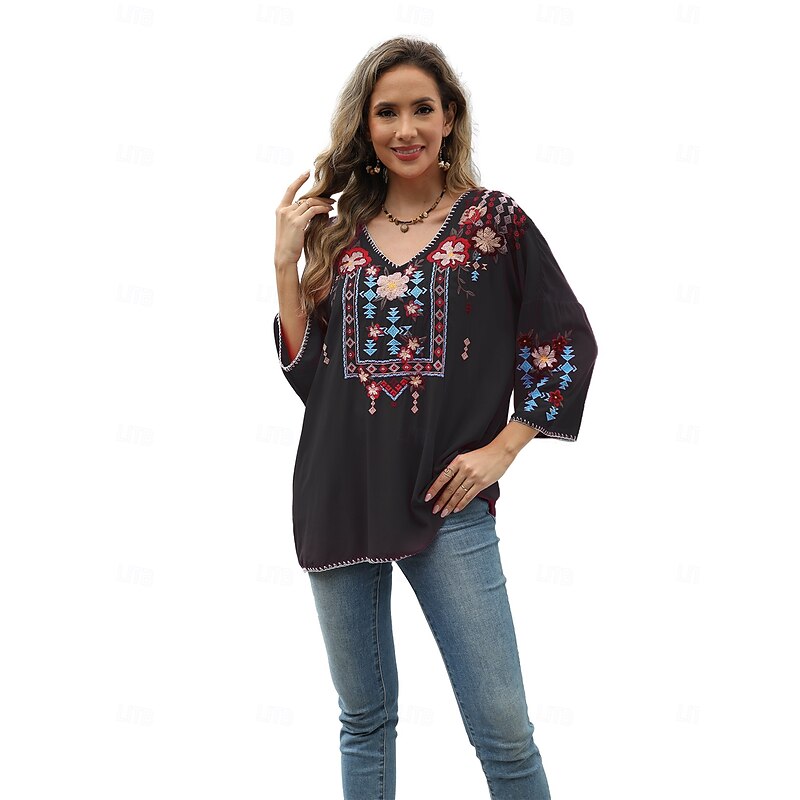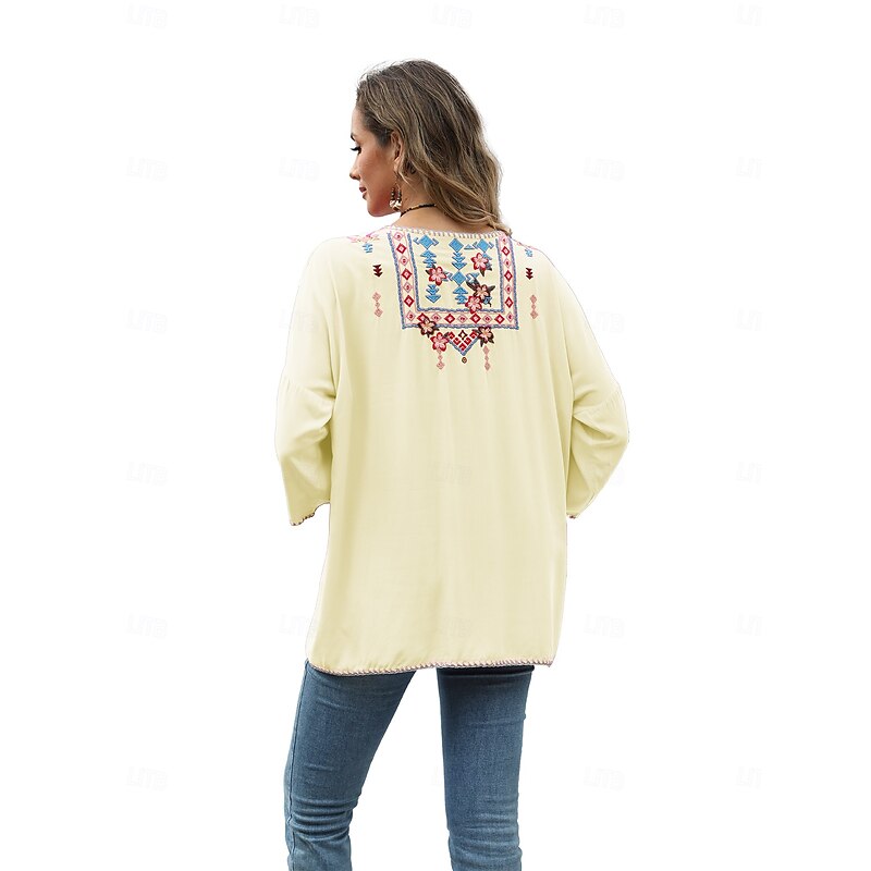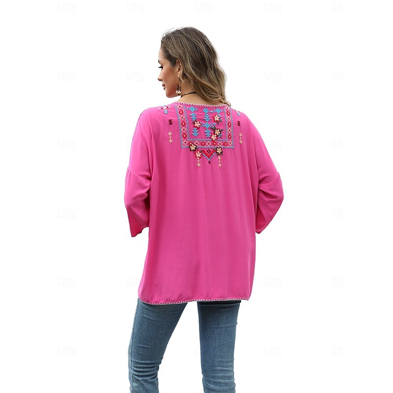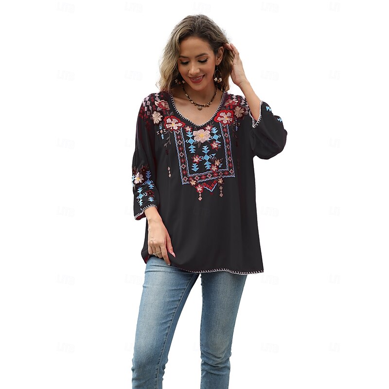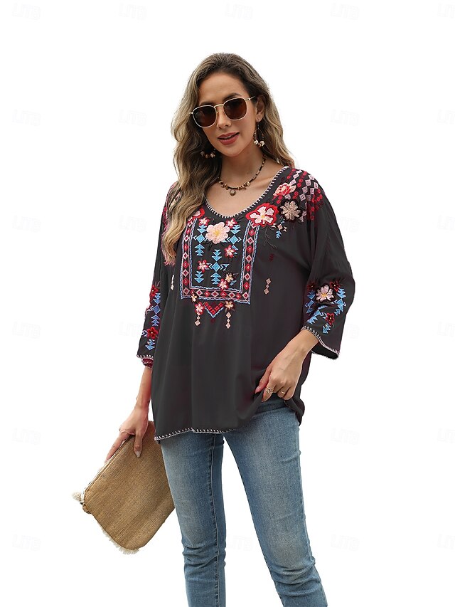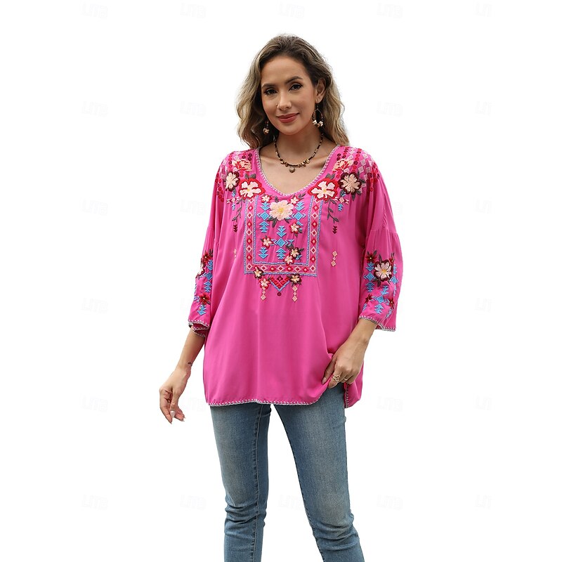 This Women's Boho Shirt Solid Color Floral Bohemia Daily Luxurious 3/4 Length Sleeve Elbow Sleeve Crew Neck Regular Tops Work Daily Going out Embroidered Black Yellow Rose Pink Summer combines elegant design with practical functionality. Every detail has been carefully considered to ensure you get the foremost possible experience. The supreme construction means this product will serve you well for years to come.