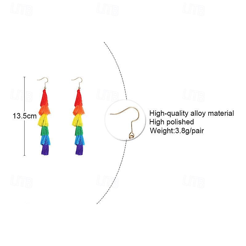 Highlights [Fabric] Crafted from soft, lightweight fabric tassels, these earrings offer a relaxing feel for all-day wear. The high-quality fabric ensures durability and vibrant color retention, providing a long-lasting accessory that maintains its bold hues. [Design Highlights] Featuring a cascading arrangement of multicolored tassels, each layer is precisely dyed in a spectrum of rainbow colors, creating a playful and eye-catching effect. The simple hook closure ensures ease of wear, making them both practical and trendy. [Occasions] Ideal for Pride Parades, Pride Month festivities, masquerade parties, and other celebratory events, these earrings are perfect for expressing individuality and supporting the LGBT community. They add a splash of color to any outfit, making them suitable for both casual and festive occasions. [Style and Fit] Designed for women, these earrings complement any style, from casual to glamorous, providing a bold fashion statement. Their lightweight nature ensures they are comfortable to wear during extended periods. [Size Notice] One size fits all, offering a versatile option that suits a variety of preferences and styles, while maintaining comfort and ease of use for different age groups.