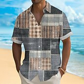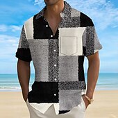 sought-after ! Men's Geometric Color Block Patchwork Shirt Summer Shirt Button Up Shirt Short Sleeve Fashion Casual Vacation Holiday Streetwear Summer Turndown 3D Print Front One Pocket Linen fancy Shirt Black Khaki