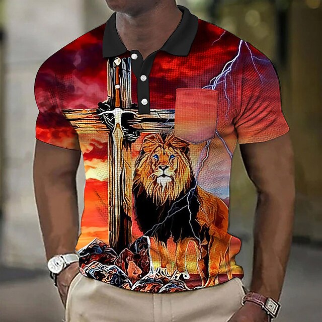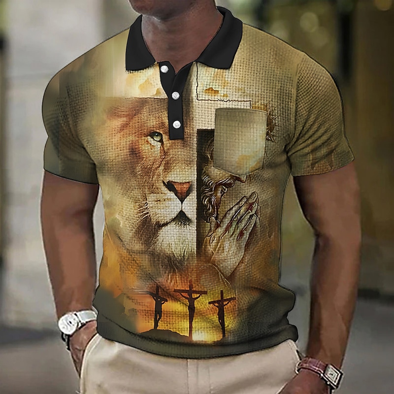sought-after ! Men's Lion Graphic Prints Cross Waffle Polo Shirts Polo Shirts Lapel Polo Button Up Polos Golf Shirt Short Sleeve Shirt Turndown Outdoor Street Light Yellow Black Yellow Red Blue Print Clothing