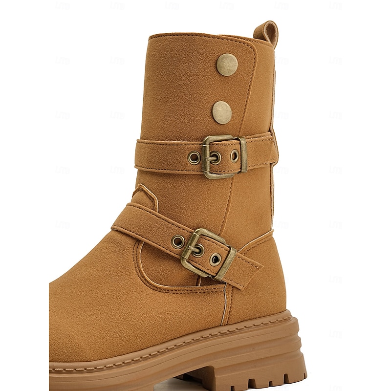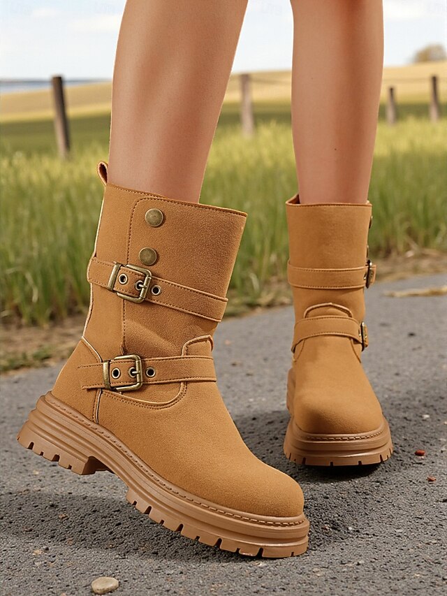Why Choose Women's Camel Mid-Calf Boots with Double Buckle Straps and Chunky Lug Sole, plush Outdoor Riding Boots for Fall Winter Casual Wear?