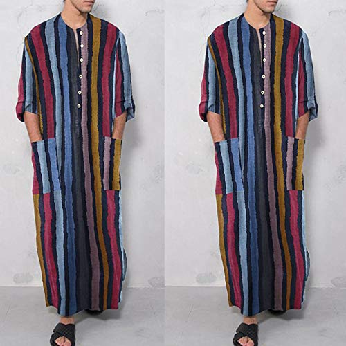Why Choose Men Colorful Striped Kaftan Robe Arabic Long Sleeve Buttons Maxi Loose Tops with Pockets Dubai Clothing?