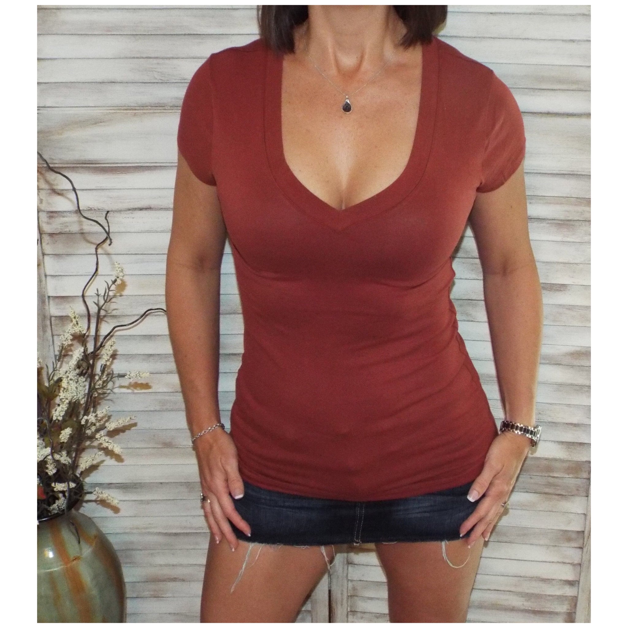More information about "Basic Babe" Low Cut V-Neck Cleavage Baby Slimming Basic Tee Shirt Dk Rust 1X/2X/3X